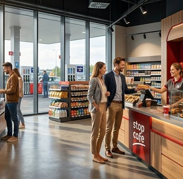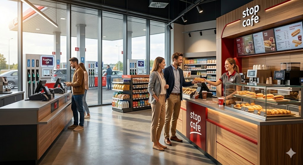 Efekt Gastronomiczny: Uwolnienie klienta od stania w kolejce przy kasie "paliwowej" sprawia, że wchodzi on do strefy Stop Cafe jako klient relaksacyjny, gotowy na zakup kawy i ciepłego posiłku, co zwiększa marżę pozapaliwową o średnio 35%.