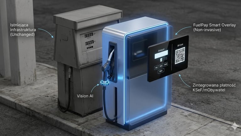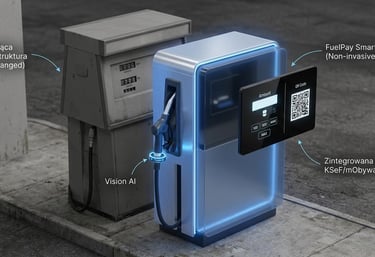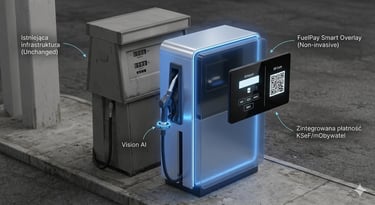 FuelPay to przełomowa technologia typu Smart Overlay. Nie wymieniamy Twoich dystrybutorów – nakładamy na nie inteligentną, cyfrową "skórę". To rozwiązanie integruje istniejącą infrastrukturę z mObywatelem i KSeF w zaledwie 48 godzin, bez przerywania pracy stacji i kosztownych prac ziemnych.