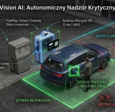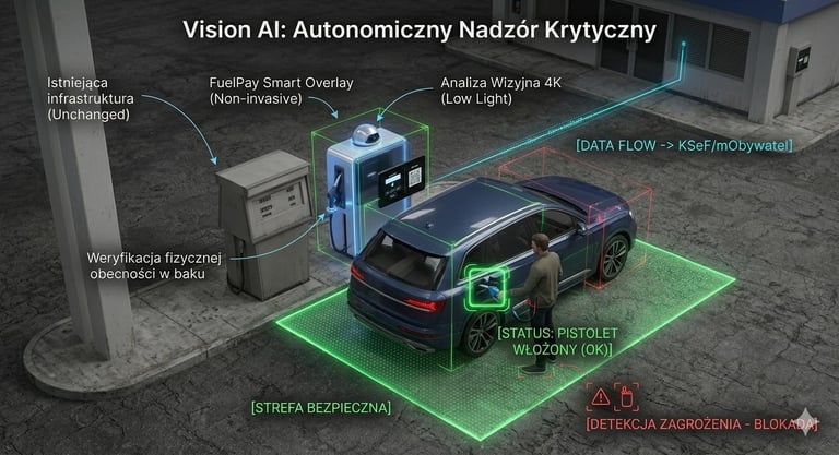 Architektura Vision AI Safety: Prawnie zastrzeżona metoda weryfikacji fizycznej obecności pistoletu w baku jako warunku koniecznego do odblokowania przepływu cieczy.